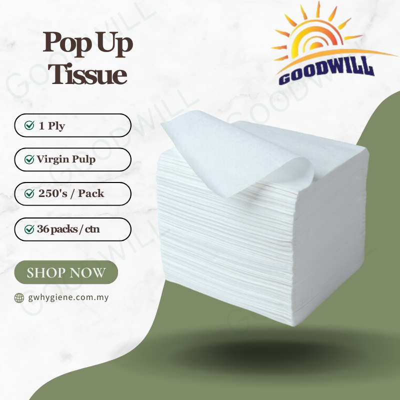 1PLY Pop Up Tissue made from 100% Virgin Pulp, packed with 250 sheets per pack and 36 packs refill pack per carton. Perfect for offices, restaurants, hotels, and commercial spaces.