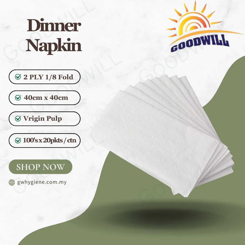 Premium 2-ply dinner napkin made from 100% virgin pulp for superior softness and strength. Ideal for restaurants, catering services, hotels, and event setups.